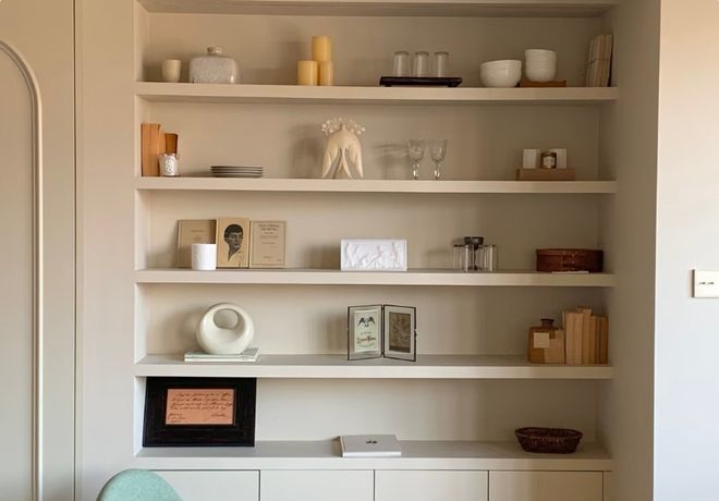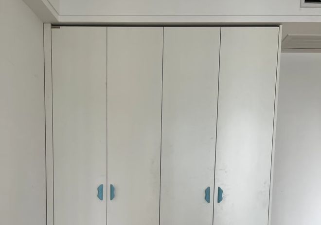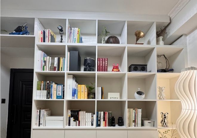 一门到顶的柜子也是目前的支流。摆满饰品,做为过来人,做了无拉手设想,但现实倒是书摆的参差不齐。