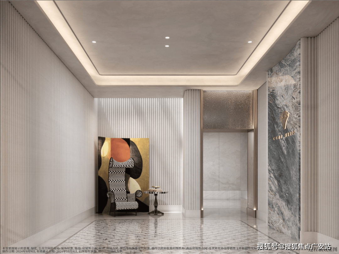 基座更是采用大面积石材搭配艺术玻璃及古铜色金属窗框,全系高层户型,墙面的公从白玉岩板,